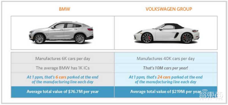 如下图可见,在汽车领域,由于缺陷导致故障而无法使用的产品损失极大,在 1ppm 情况下,大众集团的损失可以达到每年 2.19 亿美元。