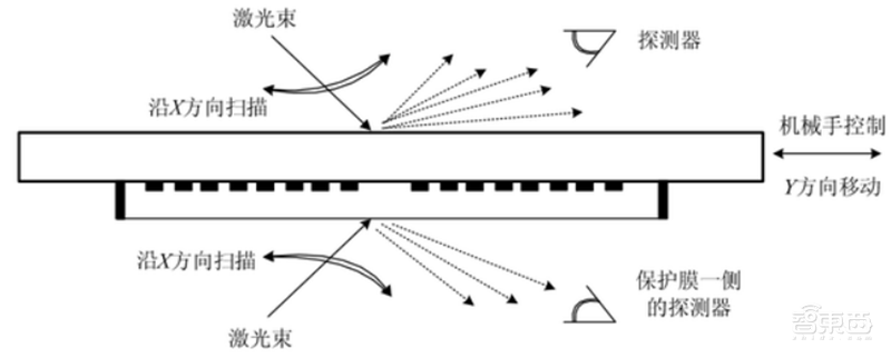 Fab 中对掩模缺陷的检测分为在线和离线两种。在线检测是指每次曝光之前和之后对掩模板表面检测。这通常是依靠光刻机中内置的检测单元来完成的。最常见的是集成在 ASML系列光刻机上的掩模检测系统。IRISTM 对即将被使用的掩模或刚使用完毕后的掩模的正反两面分别扫描,发现吸附在掩模上的颗粒,并报警。光刻工程师看到报警信号后做相应处理。图 16 是 IRISTM 工作的原理图。在做颗粒扫描时,掩模沿 Y 方向运动由机械手控制,X 方向的扫描由激光束的移动来实现。完成一次 IRISTM 扫描的时间大约等价于 2 到 3 个晶圆曝光的时间。通常对一批晶圆可以只做一次 IRISTM 扫描,这样可以减少占用生产的时间,提高光刻机的产能。