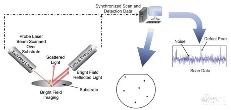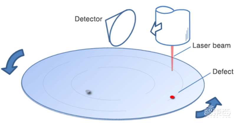 用于无图形晶圆缺陷检测的基本原理相对简单。激光束在旋转的晶圆表面进行径向扫描,以确保光束投射到所有晶圆表面。激光从晶圆表面反射,就像从镜子反射一样,如上图所示。这种类型的反射称为镜面反射。当激光束在晶圆表面遇到粒子或其他缺陷时,缺陷会散射激光的一部分。 可直接检测散射光(暗场照明)或反射光束(亮场照明)中强度的损失。