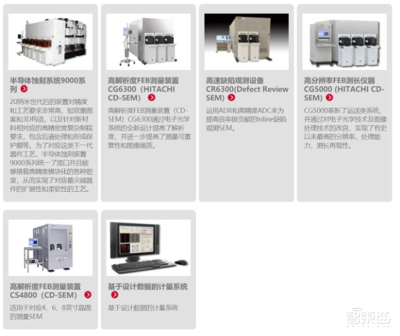 主要检测设备:半导体蚀刻系统 9000 系列:统一接口并且能够搭载高精度模块化的各种腔室,从而实现了对应最尖端器件的扩展性和柔软性的工艺;高解析度 FEB 测量装置 CG6300(HITACHI CD-SEM):通过电子光学系统的全新设计提高了解析度,并进一步提高了测量可重复性和图像画质;高速缺陷观测设备 CR6300(Defect Review SEM):运用 ADR 和高精度 ADC 来为提高良率做贡献的 Inline 缺陷观测 SEM。