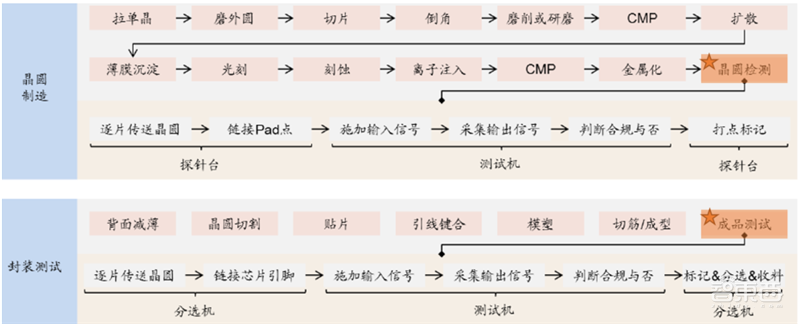 半导体后道测试设备主要是用在晶圆加工之后、封装测试环节内,目的是检查芯片的性能是否符合要求,属于电性能的检测。如下图可见晶圆检测和成品测试为晶圆制造和封装测试的最终步骤: