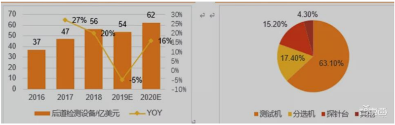 2020 年后道测试设备市场规模约 62 亿美元。根据 Gartner 数据,2016 年至 2018 年全球半导体后道测试设备市场规模为 37 亿、47 亿、56 亿美元,年复合增长率为 23%,2019 年根据 SEMI 发布全球半导体设备中后道设备占 9%计算,主要受到全球半导体设备景气的影响下降至 54 亿美元。后道量测设备中测试机在 CP、FT 两个环节皆有应用,因此占比最大达到 63.1%,其他设备分选机占 17.4%、探针台占 15.2%。测试机占比大的原因:在设计验证和成品测试环节,测试机需要和分选机配合使用;在晶圆检测环节,测试机需要和探针台配合使用。