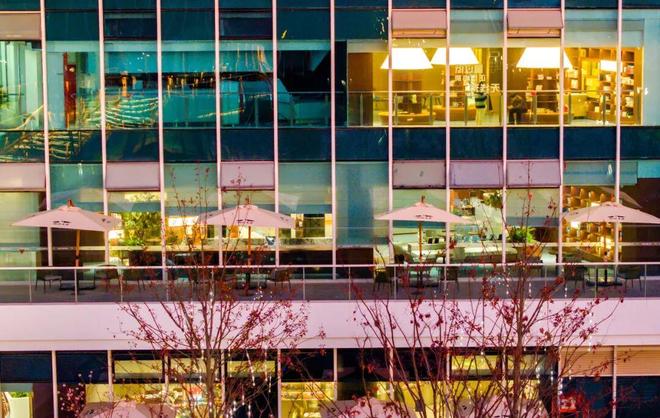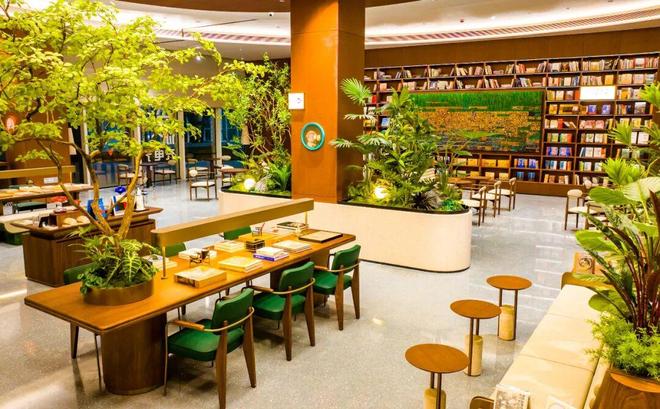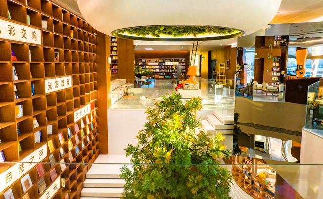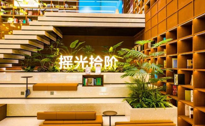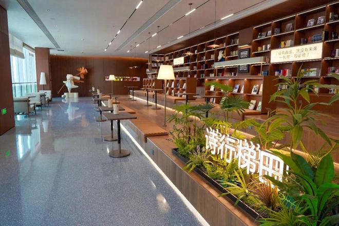 “诗行梯田”阅读区的设计,令人惊叹。三层缓缓升高的原木台阶,如错落有致的江南梯田,读者可随意坐下、倚靠,沉浸于书海。台阶上陈列着中外诗歌、小说与散文的精华。龙杨指向对面明亮的窗边阅读座:“当您从文字的秘境中偶尔抬头,满窗的公园绿意便会温柔地涌入眼帘。书中的抽象世界与窗外的具象生机,在此刻达成一场静默而深刻的对话。”